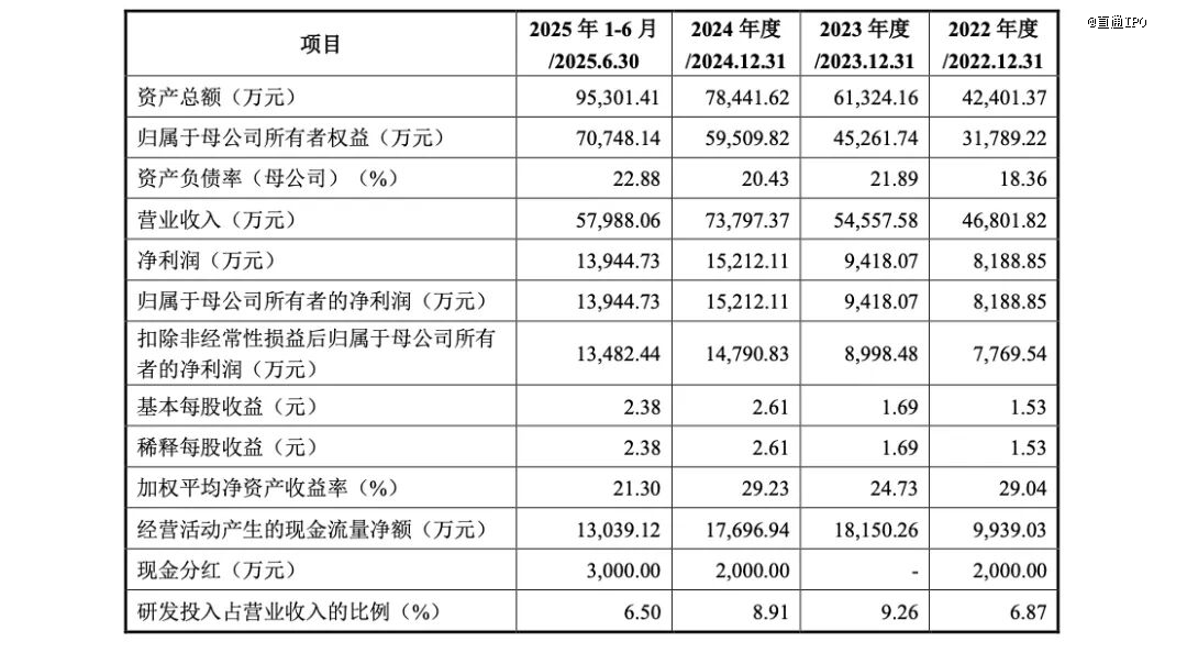 报告期内,好盈科技的营业收入分别约4.68亿、5.46亿、7.38亿、5.80亿元;净利润分别约8188.85万、9418.07万、1.52亿、1.39亿元;扣非归母净利润分别约7769.54万、8998.48万、1.48亿、1.35亿元。