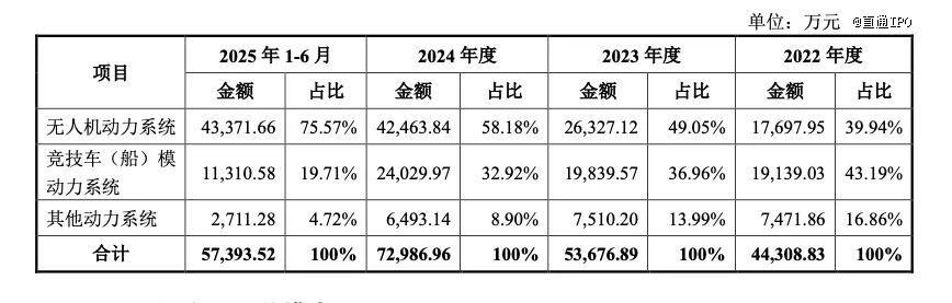 2022-2024年及今年上半年(下称:报告期),好盈科技来自无人机动力系统的收入分别约1.77亿、2.63亿、4.25亿、4.34亿元,占比分别为39.94%、49.05%、58.18%、75.57%,增速明显;来自竞技车(船)模动力系统的收入分别约1.91亿、1.98亿、2.40亿、1.13亿,稳中微降。