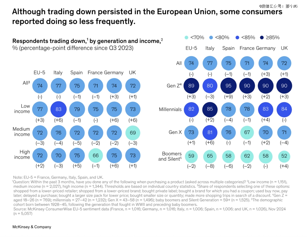 McKinsey在此前的一份报告指出,截至2024年秋末,欧洲五国的Z世代和千禧一代消费者中,高达80%至95%的人表示有降级消费行为。相比之下,X世代及前三个世代中,仅有52%至81%的人正在降级消费。