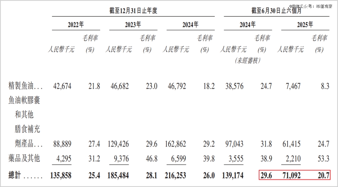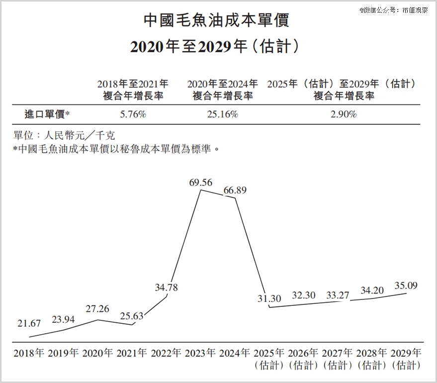 招股书显示,2018年以来国内毛鱼油成本进入了快速增长通道,2023年及2024年受到南美洲收紧捕捞配额及终端产品需求增加影响,成本单价达到了66元/千克以上,预估2025年会大幅回落。而毛利率大降更多源自此前采购的高价原材料。