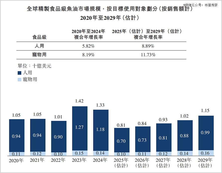 招股书显示,以销量额计算,2020年到2022年由于受到口罩事件影响人用食品级鱼油市场规模由9.4亿美元小幅下降到9亿美元,到2024年反弹至11.2亿美元,此后预计又将陷入低迷,到2029年才逐渐恢复至9.9亿美元,依然没有回到2024年的水平。