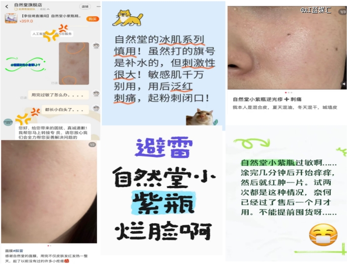 其产品主打纯 天然、温和等概念,但在黑猫投诉平台上,与自然堂相关的投诉词条累计已高达1656条,大部分涉及产品使用后出现过敏等不适症状。小红书平台上的相关吐槽帖也层出不穷,反映出产品品质与营销承诺之间存在落差。