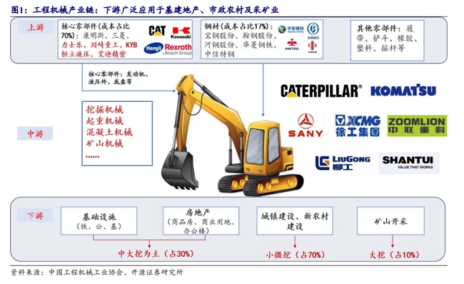 工程机械被广泛应用于基建、地产、市政、农村及采矿等领域,被视为经济的晴雨表。工程机械上游为钢材、核心零部件,下游应用为水利、电力和道路等基础设施建设,以及房地产开发、矿山开采等。工程机械的销量与经济活动热度相关,被视为宏观经济的晴雨表。