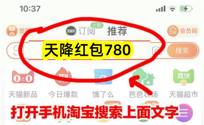 2.淘宝用户收藏核心口令「天降红包780」,10月15日开抢后从历史记录快速进入;