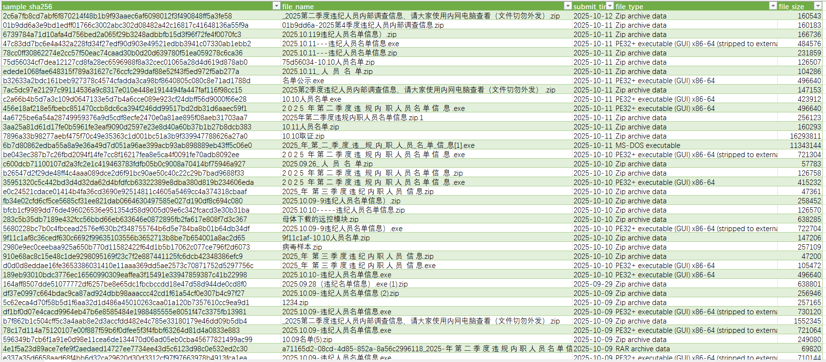 在微信、企业微信、钉钉、飞书等办公IM软件中,骗子以“2025第二季度违纪人员内部调查信息”“机构编制违规处理通知”为诱饵,附上带恶意链接的压缩包或EXE文件,文件名明确标注“内网查看”“切勿外传”,伪装成企业内部涉密文档,降低用户戒备心。从8月4日开始投递至今,此类样本已覆盖zip、PE等多种格式,仅9月22日单周就捕获80个样本,为近期高峰。