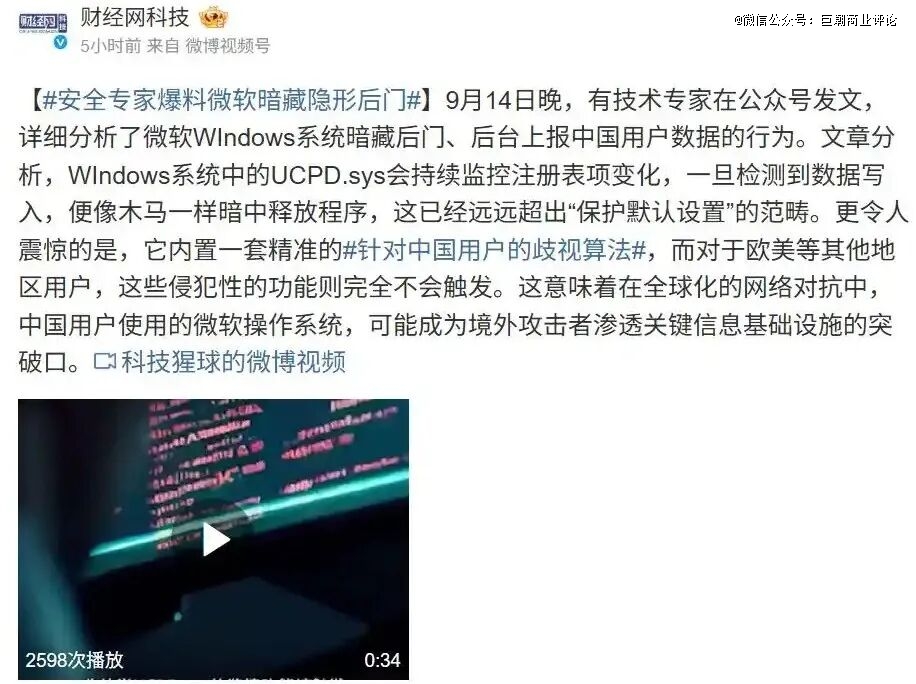 近些年来,诸如思科网络设备后门事件、SolarWinds Orion平台渗透等前车之鉴不远,微软虽声称“不创建后门”,但事实却并非如此。9月份就有技术专家质疑,微软UCPD驱动程序本意为“保护用户”,实则对中国软件“区别对待”,尤其针对360浏览器、WPS等竞品进行“监控”。