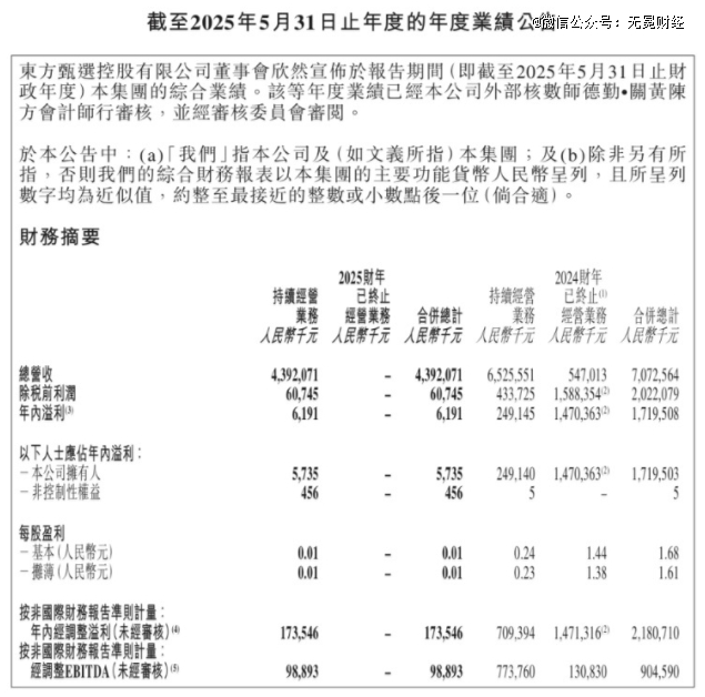 财报显示,2024年6月至2025年5月,东方甄选持续经营业务总营收从65亿元跌至44亿元,降幅达32.7%;总GMV从143亿元缩水至87亿元,下滑39.2%。尽管下半年从上半年净亏损9650万元扭亏为盈至620万元,这点盈利相较于超20亿元的营收下滑缺口,终究有些杯水车薪,整体经营下行趋势继续。