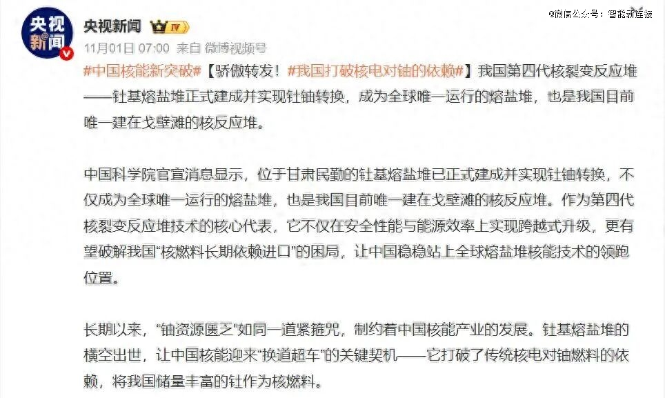 1日,央视罕见公开报道了,第四代国产钍基熔盐核反应堆实现钍铀转换,开启运行的消息。美国、欧盟、印度追了30年的技术,中国超前首发了。