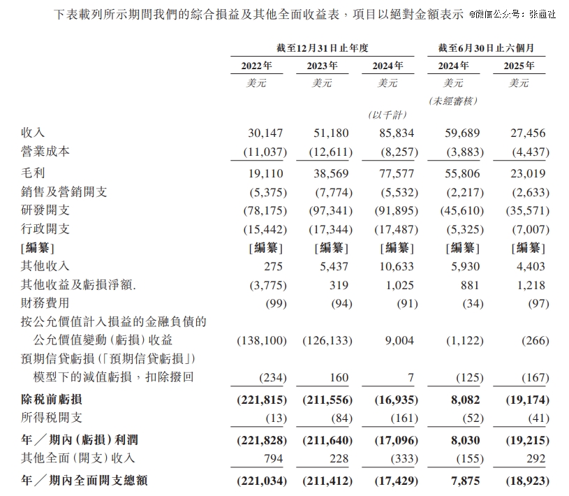 财务表现方面,公司呈现“营收快速增长、亏损持续收窄”的发展态势。招股书显示,2022年至2024年,英矽智能营收分别为3014.7万美元、5118.0万美元、8583.4万美元,整体呈现较快增长;同期净亏损分别为2.2亿美元、2.1亿美元、1710万美元,三年累计亏损约4.5亿美元。