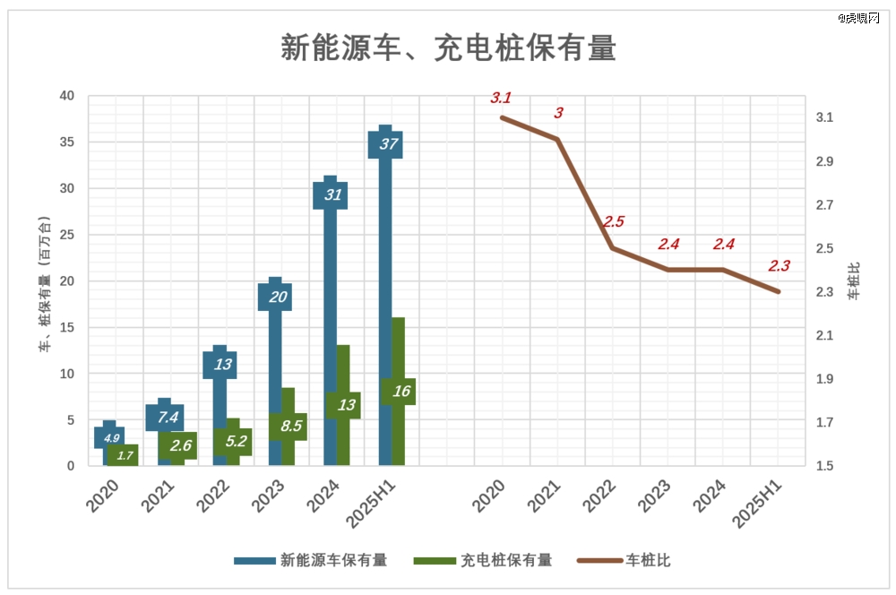 截至2025年6月末,新能源车保有量已经达到3689万台,充电桩保有量约1604万台,存量车桩比跌至2.3:1。