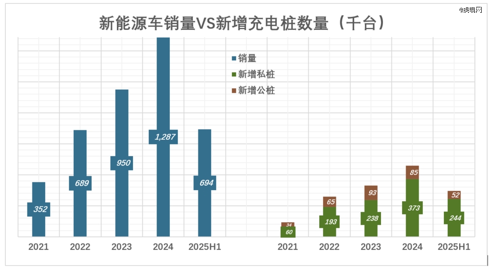 2025年H1,新能源车销量693.7万台,私人桩增加244万台,公桩只增加51.7万台。