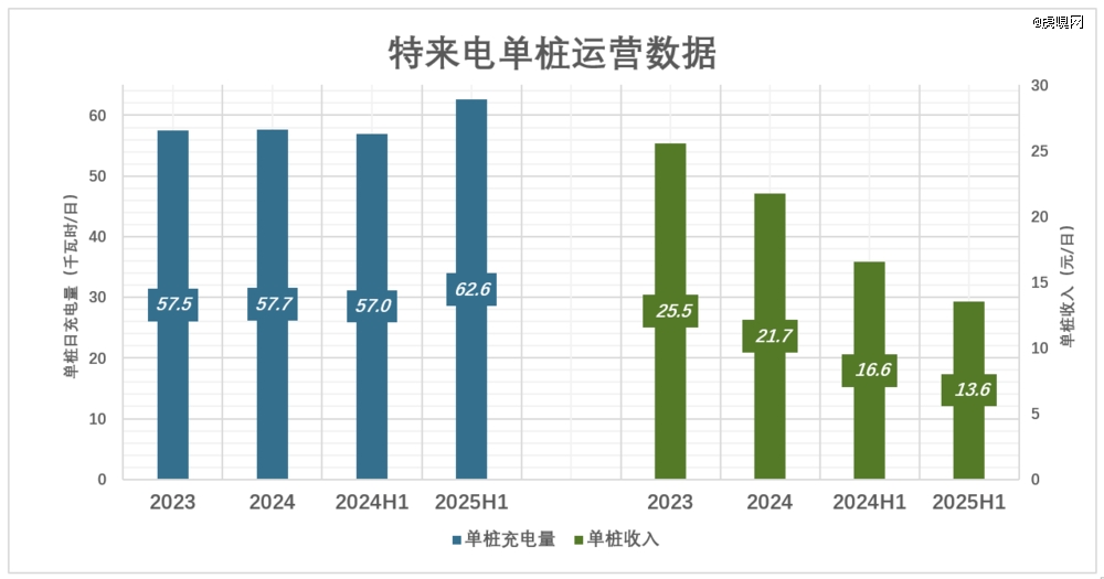 2025年H1,期初、期末充电桩数量增至75.1万台,上半年充电量达85亿度,收入18.4亿元。每台充电桩每日充电量为62.6度、收入13.6元;