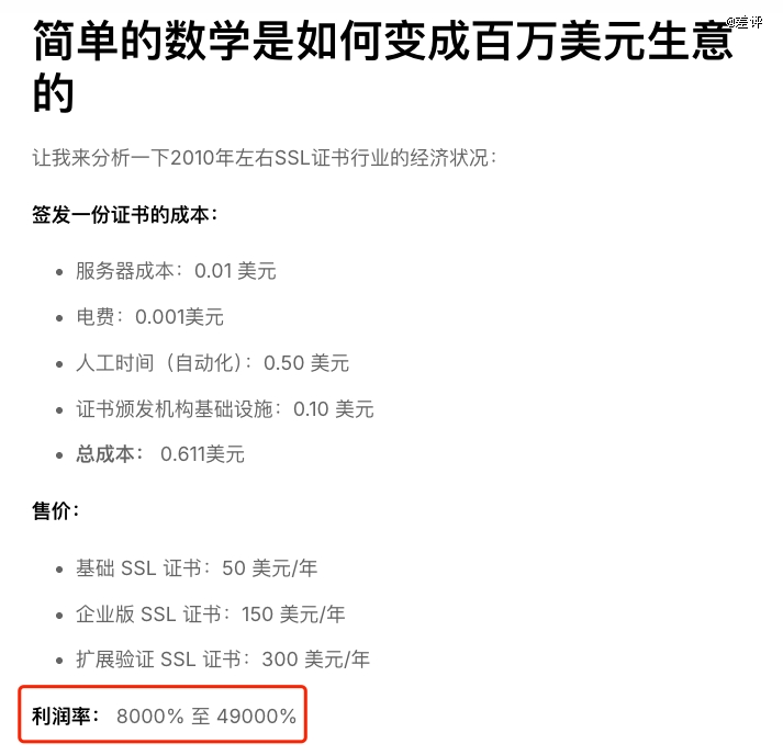 里面是这样说的,高价 SSL 证书是一场彻头彻尾的互联网骗局, 同时也是一个利润率 49000% 的暴利行业。。。