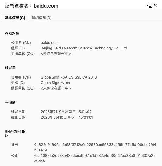 继续点击 “证书有效” 按钮,你就会看到百度正在使用的 SSL 安全证书。
