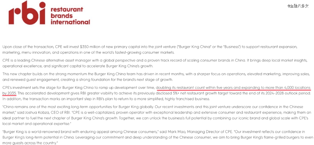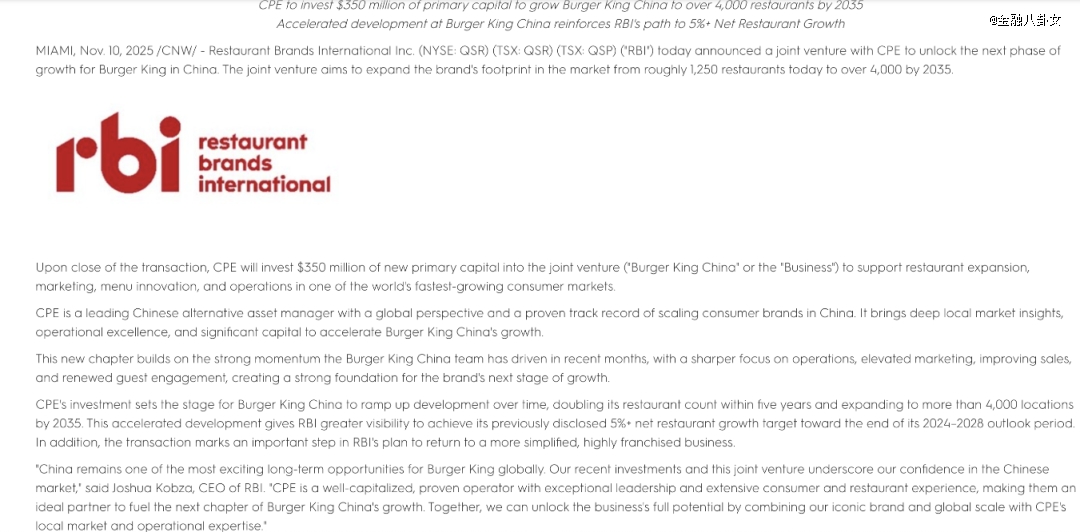 11月10日,RBI集团(汉堡王、Tim Hortons、Popeyes的母公司)与CPE源峰宣布,将成立汉堡王中国的合资公司。CPE源峰将持有约83%的股权,RBI只保留象征性的17%,交易预计在明年初完成。