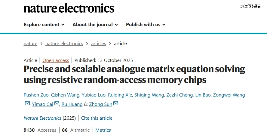 近日,燕芯微创始团队,北京大学集成电路学院王宗巍研究员与北京大学人工智能研究院孙仲研究员团队,合作研制出基于自主知识产权钽基阻变存储器(ReRAM)的高精度、可扩展模拟矩阵存算一体芯片,该系统在求解大规模MIMO信号检测等关键科学问题时可以实现计算吞吐量与能效的大幅提升。相关成果以“Precise and scalable analogue matrix equation solving using resistive random-access memory chips”为题在国际学术期刊《自然·电子学》(Nature Electronics)杂志上发表论文。
