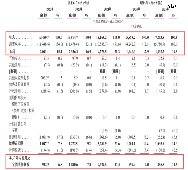 2022年、2023年、2024年及2025年1-5月(报告期),公司的收入分别为134.9亿元、138.15亿元、151.63亿元、72.14亿元,净利润分别为9.13亿元、10.81亿元、26.3亿元、8.56亿元;报告期内毛利率分别为15.1%、16.9%、28.2%、19.9%。