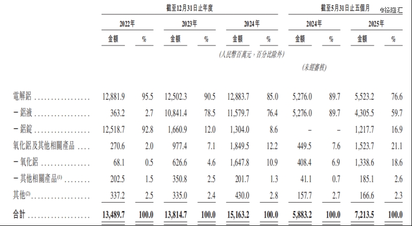 公司高度重视电解铝产业链自给自足,氧化铝的收入占比由2022年的0.5%上升至2025年1-5月的18.6%。