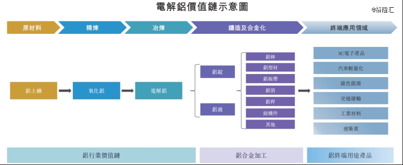 电解铝及氧化铝产品需求受其在下游市场的应用推动,包括3C电子产品、汽车轻量化、绿色能源、交通运输、工业材料及建筑业。