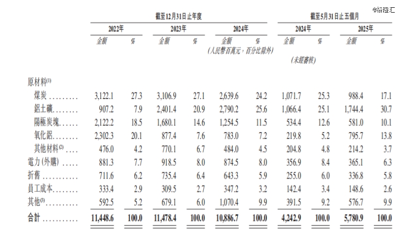此外,铝土矿也是重要的原材料。2022年至2025年1-5月,铝土矿的成本占比由7.9%提高至30.7%。