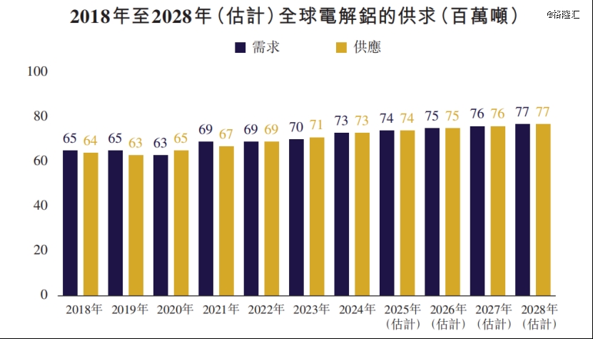 2018年至2028年(估计)全球电解铝的供求(百万吨),来源:招股书