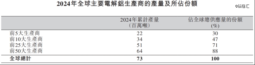 2024年全球主要电解铝生产商的产量及所占份额,来源:招股书