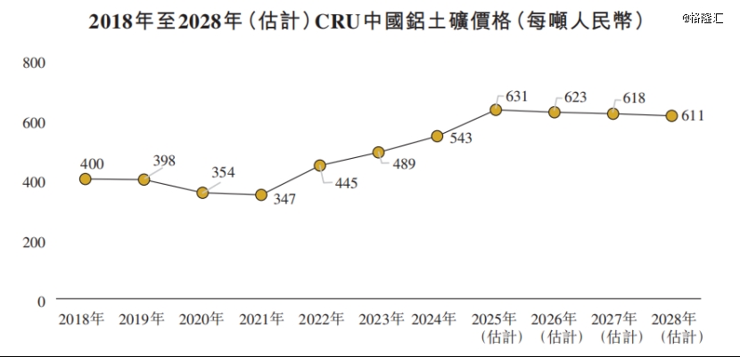 由于增加使用从海外进口的铝土矿,招股书中预测,2028年,CRU中国铝土矿价格将大幅上涨至约611元/每吨。