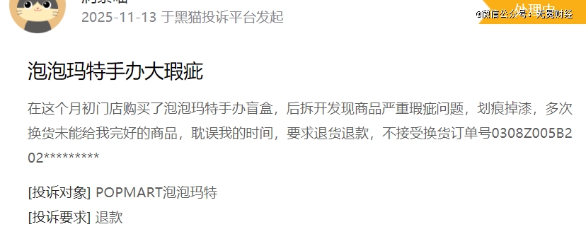 ▲黑猫投诉平台上关于泡泡玛特的投诉。