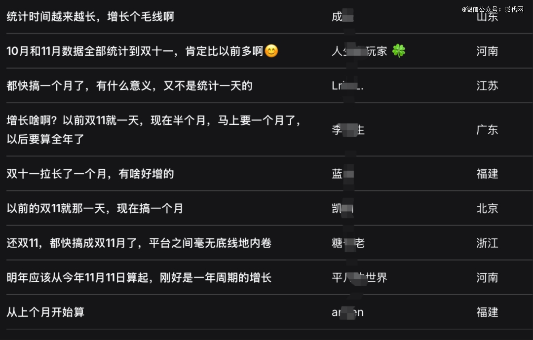 平台的这一操作,虽然可能在报表上制造出持续的增长曲线,却严重消耗了“双11”这一IP的独特价值。一位广东商家直言:“都快搞一个月了,有什么意义,又不是统计一天的”。这句话点出了问题的核心:当狂欢的仪式感被平庸的日常促销所取代,双11也就失去了其固有的魅力与爆发力。