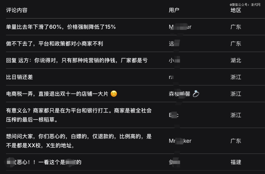 与此同时,新规的实施进一步加剧了商家的退出潮。“电商税一弄,直接退出双11的店铺一大片”,这条来自浙江的评论指出,税务监管的规范化让原本依靠税收灰色地带的经营模式难以为继。而“想问问大家,你们恶心的,白嫖的,仅退款的,比例高的...”这条追问,则反映了商家在平台规则倾斜于消费者的背景下,所面临的恶意退款等新型经营风险。