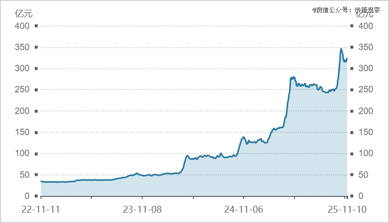 其中,截至11月12日,黄金ETF(159934,联接基金A/C:000307/002963)流通规模高达332.46亿元,较2024年3月飙升五倍之多,成为全市场流动性较好的主力基金之一。