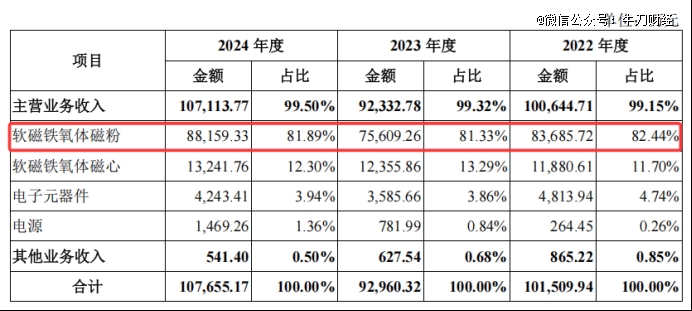 来自软磁铁氧体磁粉的收入在春光集团营收占比超八成。招股书显示,2022-2024年,软磁铁氧体磁粉收入波动明显,分别为8.37亿元、7.56亿元和8.82亿元,占各期营业收入比例分别为82.44%、81.33%和81.89%。其中,2023年,出现了近10%的同比下滑,最终导致公司整体营收出现了明显的负增长。