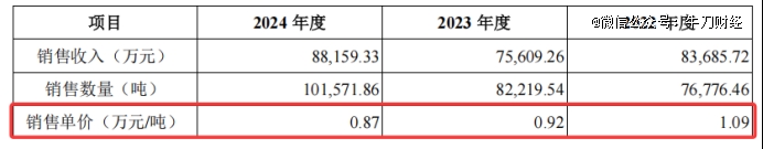 对此,春光集团在招股书中表示,2023年,公司软磁铁氧体磁粉产品平均单价由2022年的1.09万元/吨下降至0.92万元/吨,同比下降15.63%,而销量由2022年的7.77万吨上升至8.22万,同比增长7.09%,由于单价下降幅度高于销量上升幅度,最终导致公司软磁铁氧体磁粉的销售收入相较2022年减少8076.46万元,同比下降9.65%。
