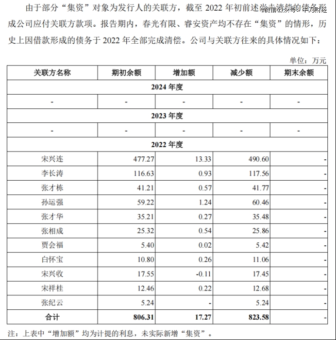 招股书显示,春光集团还曾存在集资情形。公司实控人韩卫东曾控制的企业睿安资产作为资金管理平台向内部员工、股东等“集资”,实际执行中借款对象包括公司及子公司员工、股东或其亲属、朋友。2020年末,资金管控职能转至春光有限,“集资”债务也随之转移。截至2022年初,部分关联方“集资”对象本息合计约823万元。
