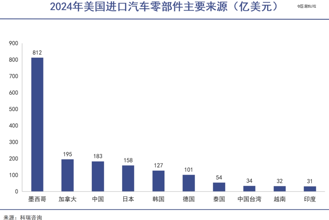 到如今,美国汽车行业约60%的零部件依赖进口,主要来源包括墨西哥、加拿大、中国和日本。其中墨西哥占比超过40%,中国约11%。
