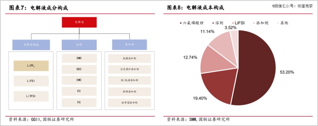 电解液素有“锂电池血液”之称,据国联证券研究,六氟磷酸锂、LiFSI、添加剂和溶剂的成本占比分别为53.2%、12.7%、11.1%和19.4%,其中六氟磷酸锂占比过半。