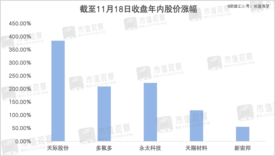 得益于六氟磷酸锂的上涨,今年以来相关上市公司的股价表现也颇为抢眼。就比如天赐材料、多氟多、天际股份、新宙邦和永太科技等,其中天际股份以超380%的涨幅位居首位,新宙邦涨幅最小但也在55%以上。