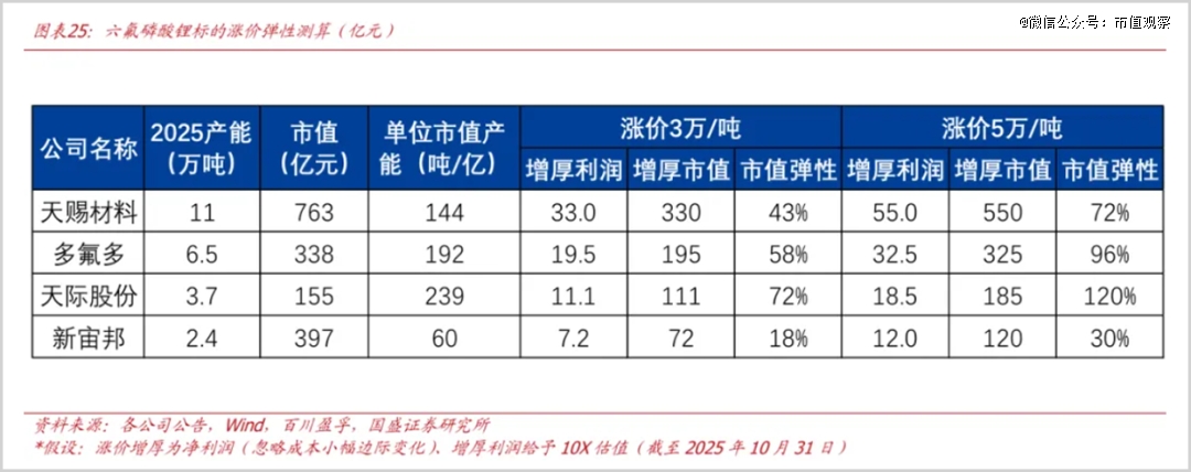 据国盛证券研究,假设本轮周期的成本边际变化较小,截至2025年10月底,在3万/吨涨价情境下天赐材料、多氟多和天际股份分别增厚利润33亿、20亿和11亿,市值弹性为43%、58%、72%;5万/吨的涨价情境下分别增厚利润55亿、33亿和19亿,市值弹性为72%、96%、120%。