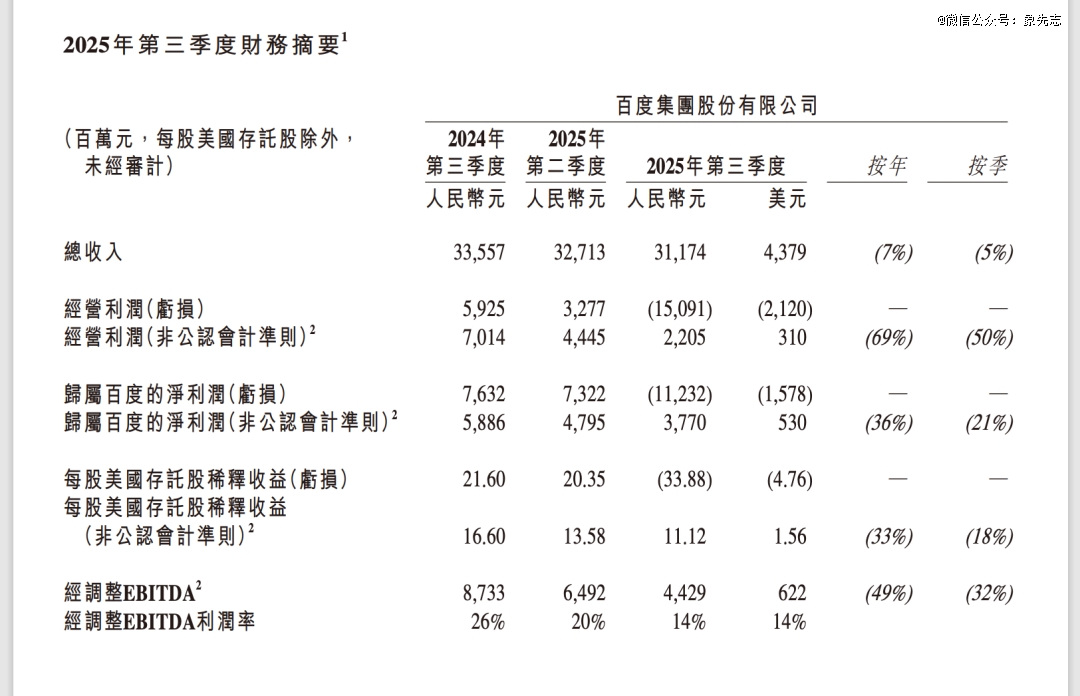然后是营收整体下滑,从 2025 年第二季度开始营收同比下滑 4%,第三季度同比下滑 7%,截至三季度已连续 2 个季度营收同比下降。其实2024 年四季度百度营收就已同比减少 2%,只是 2025 年一季度曾微增 3%,未形成连续下滑趋势。