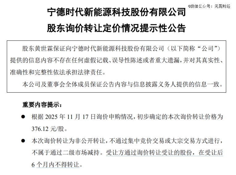 11月17日晚间,宁德时代公布询价转让情况,共收到55份有效报价单,机构热情高涨,认购超3.2倍,转让价格为376.12元/股,减持完成后,黄世霖将套现约171.63亿元。