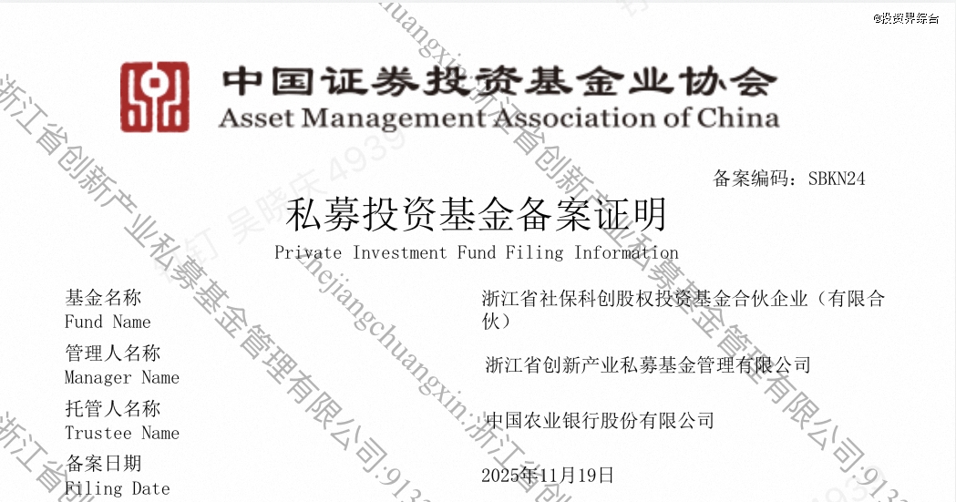 11月19日,由浙江省、全国社会保障基金理事会、中国农业银行共同发起设立的浙江省社保科创股权投资基金合伙企业(有限合伙)顺利通过中国证券投资基金业协会备案,标志着全国社会保障基金理事会与地方政府的合作成功落地。在该基金设立过程中,省创新投资集团牵头组织、各合作方高效协同、紧密配合,自基金工商注册,到全国社保基金理事会、农银投资、省创新投资集团、富浙基金、杭州资本、宁波金投等出资,直至最终完成基金备案历时仅2周,充分体现了“浙江速度”。至此,浙江社保科创基金正式启航、迈入实质性运作阶段。