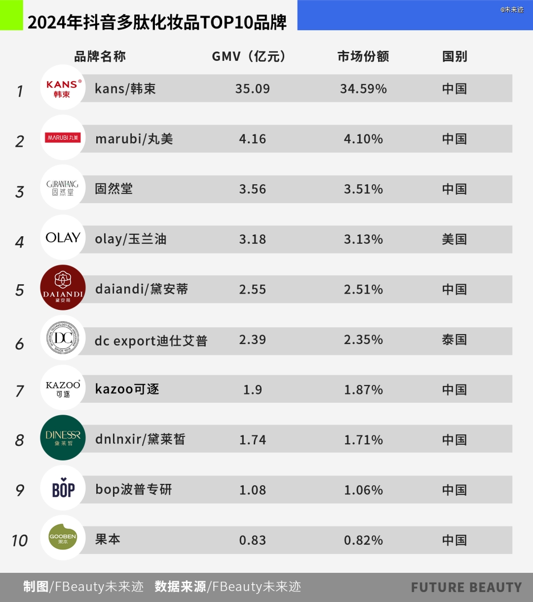 以抖音渠道为例,按产品宣称以“肽”为核心关键词的产品所产生的交易额(GMV)计算,2024年韩束品牌以34.59%的市场份额处于绝 对领 先地位(第二名市场份额为4.1%)。Top10品牌中8个为中国品牌,清晰展现了国产品牌在该细分领域的统治力。