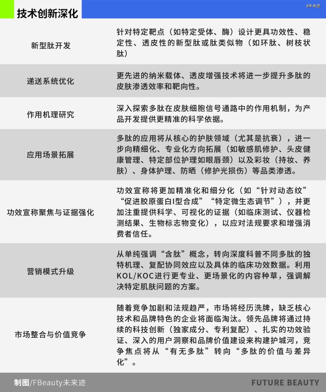 展望未来,市场在面临同质化、教育成本、功效验证和合规等挑战的同时,将朝着技术创新深化(新肽开发、递送优化)、应用场景拓展、功效宣称精准化与证据强化、营销模式升级(深度科普、场景化方案),以及市场整合与价值竞争的方向发展。