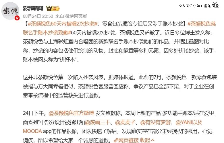 在营销方面,茶颜悦色也逐渐失去了自己的独特性,其在今年7月、8月接连两次陷入“抄袭风波”。先是新品零食“山胡椒油辣丝”的包装设计与方大同《梦想家》专辑封面设计高度重合;其后续推出的联名手账本,又被网友发现在未经授权的情况下挪用了其他网友的素材。
