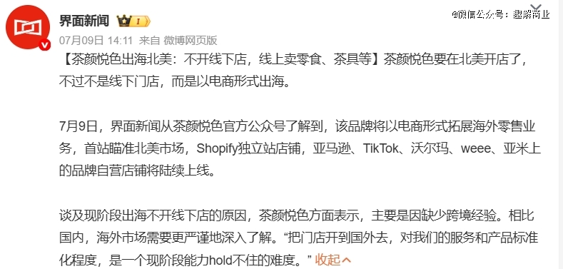 茶颜悦色在今年7月宣布以线上电商的形式出海,主要销售文创、零食等热门品类。茶颜悦色首站瞄准北美市场,以在亚马逊、TikTok Shop、沃尔玛等线上渠道建立自营店铺的方式,在海外市场推出了40多款零食和文创商品。