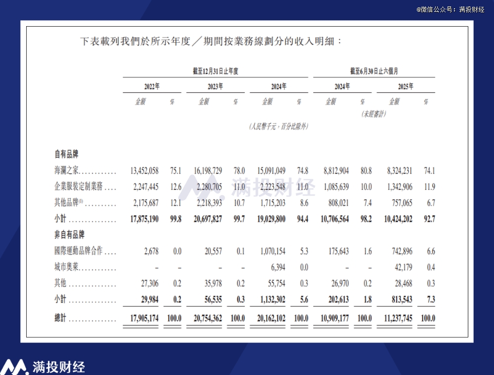主品牌依赖:70%收入占比下的增长乏力。海澜之家虽试图打造多品牌矩阵,如轻奢女装OVV、高端婴童品牌英氏、潮流男装黑鲸,但营收仍高度依赖主品牌“海澜之家”。2022—2024年及2025年前三季度,主品牌营收占比始终超过70%,2024年主品牌营收同比下滑近7%,2025年前三季度同比再降近4%。