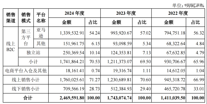 其中,线上B2C平台是公司主要的产品销售渠道。2022年至2024年,公司线上B2C模式销售收入占主营业务收入比重分别为65.96%、69.50%和70.53%。线上销售收入中,亚马逊渠道占比75%以上。