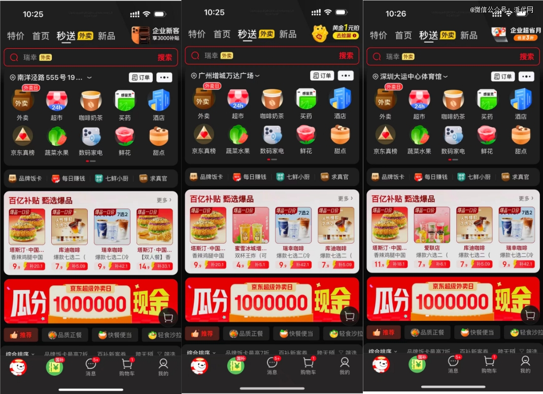 美团走的是“安心”路线,搞了个“浣熊食堂”,用后厨直播的方式,让你看着放心;京东则坚持“品质”人设,主打高净值市场,用靠谱的形象换信任;淘宝闪购就简单直接多了——掏出500亿补贴,开启“钞能力”模式。