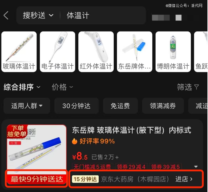 第二关,你买的东西得对路。“9分钟”的标签,目前主要贴在京东大药房的商品上,比如温度计、卫生巾、计生用品这类应急药品。如果你是想买生鲜、点外卖、来瓶酒,或者采购点超市日用品,那配送时间还是会稳稳地落在30-40分钟的常规区间里。
