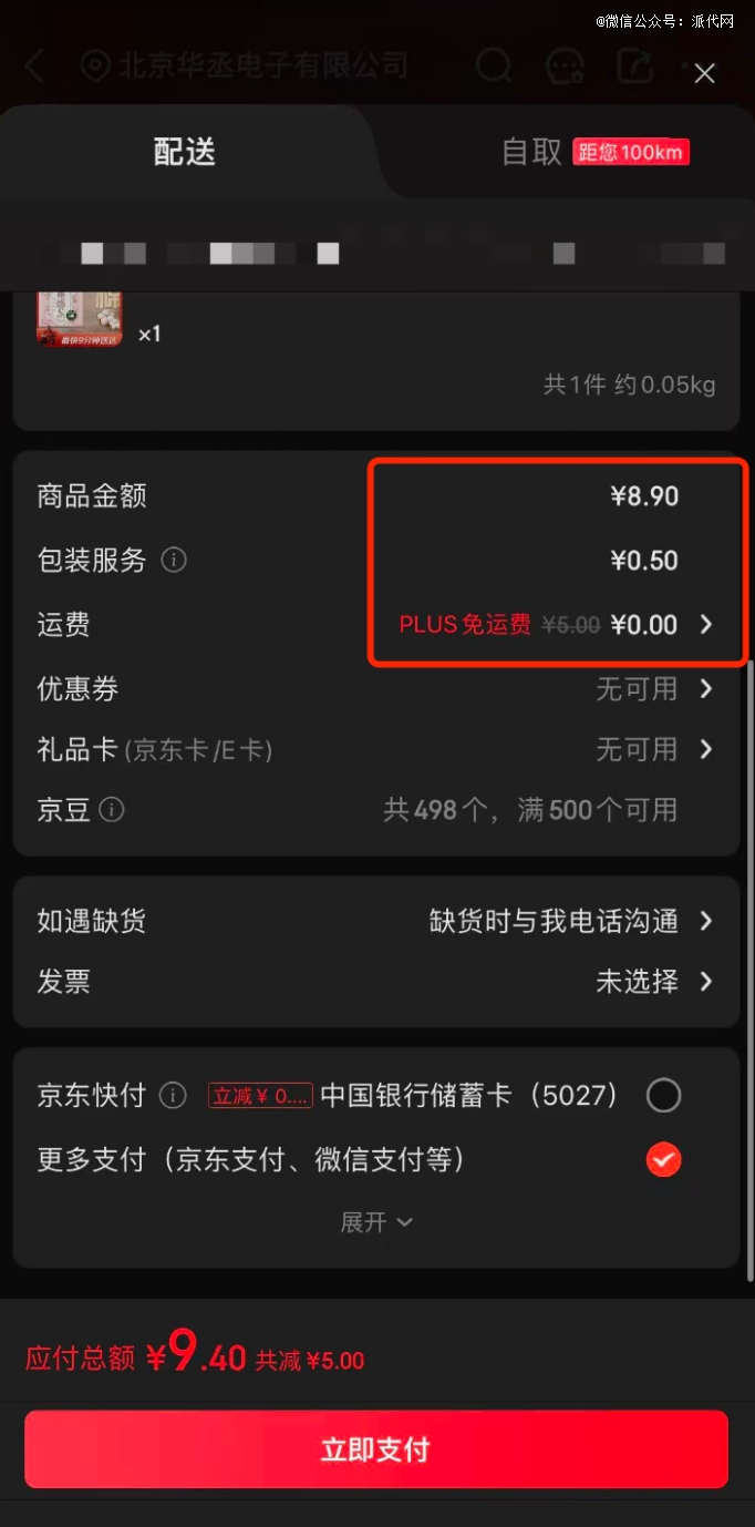 3)方便是有价的。虽然大部分商品一件就起送,但成本得留意。比如我们这单,除了8.9元的商品费,还有0.5元的包装费和5元的配送费(京东PLUS会员能免掉配送费)。所以,这极 致的速度,某种程度上也是用真金白银换来的。